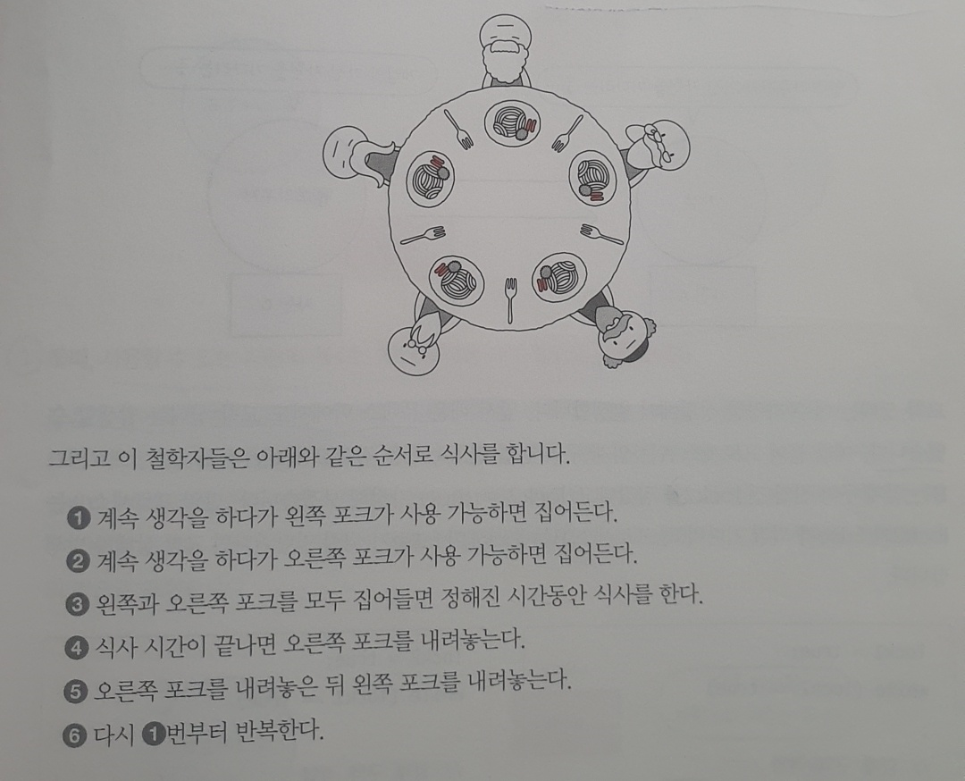 원형 식탁에 앉아있는 철학자들의 앞에는 포크 두개로 먹을 수 있는 각자의 음식이 있고 각자 오른쪽에 포크 하나가 있을 때, 두개의 포크를 들기 전까지 철학자는 생각하는 시간을 가지며 기다려야 한다면 모든 철학자가 동시에 포크를 들어 식사를 할 때 어떤 철학자도 식사를 할 수 없는 상황
